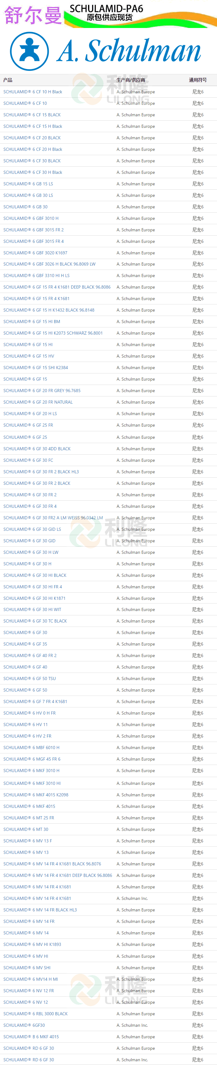 [塑料簡介:]利隆塑料專業(yè)經(jīng)營美國舒爾曼PA6,聚酰胺SCHULAMID品牌PA6塑膠原料,想要了解尼龍PA6塑膠原料,舒爾曼PA6原料價(jià)格,PA6性能用途,PA6型號和PA6物性的客戶,歡迎來電來函咨詢