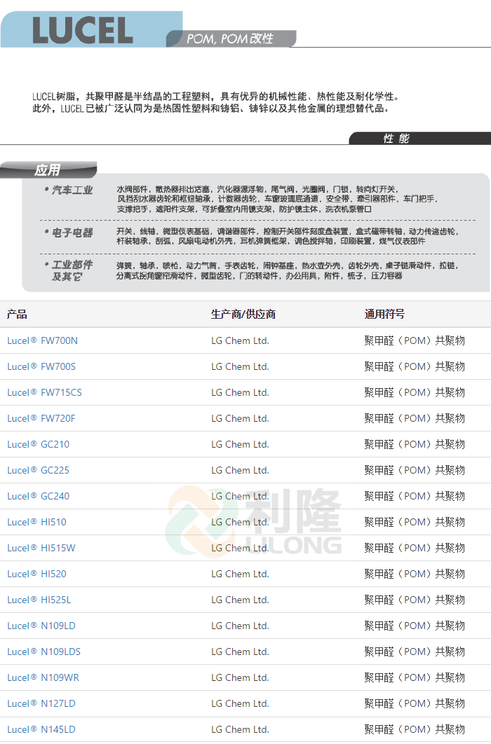 [塑料簡介:]利隆塑料專業(yè)經(jīng)營韓國LGPOM聚甲醛LUCEL品牌塑膠原料,想要了解聚甲醛POM塑膠原料,韓國LGPOM價格,POM性能用途,POM型號和POM物性的客戶,歡迎來電來函咨詢