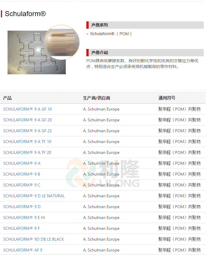 [塑料簡介:]利隆塑料專業經營美國舒爾曼POM聚甲醛SCHULAFORM品牌塑膠原料,想要了解聚甲醛POM塑膠原料,舒爾曼POM原料價格,POM性能用途,POM型號和POM物性的客戶,歡迎來電來函咨詢
